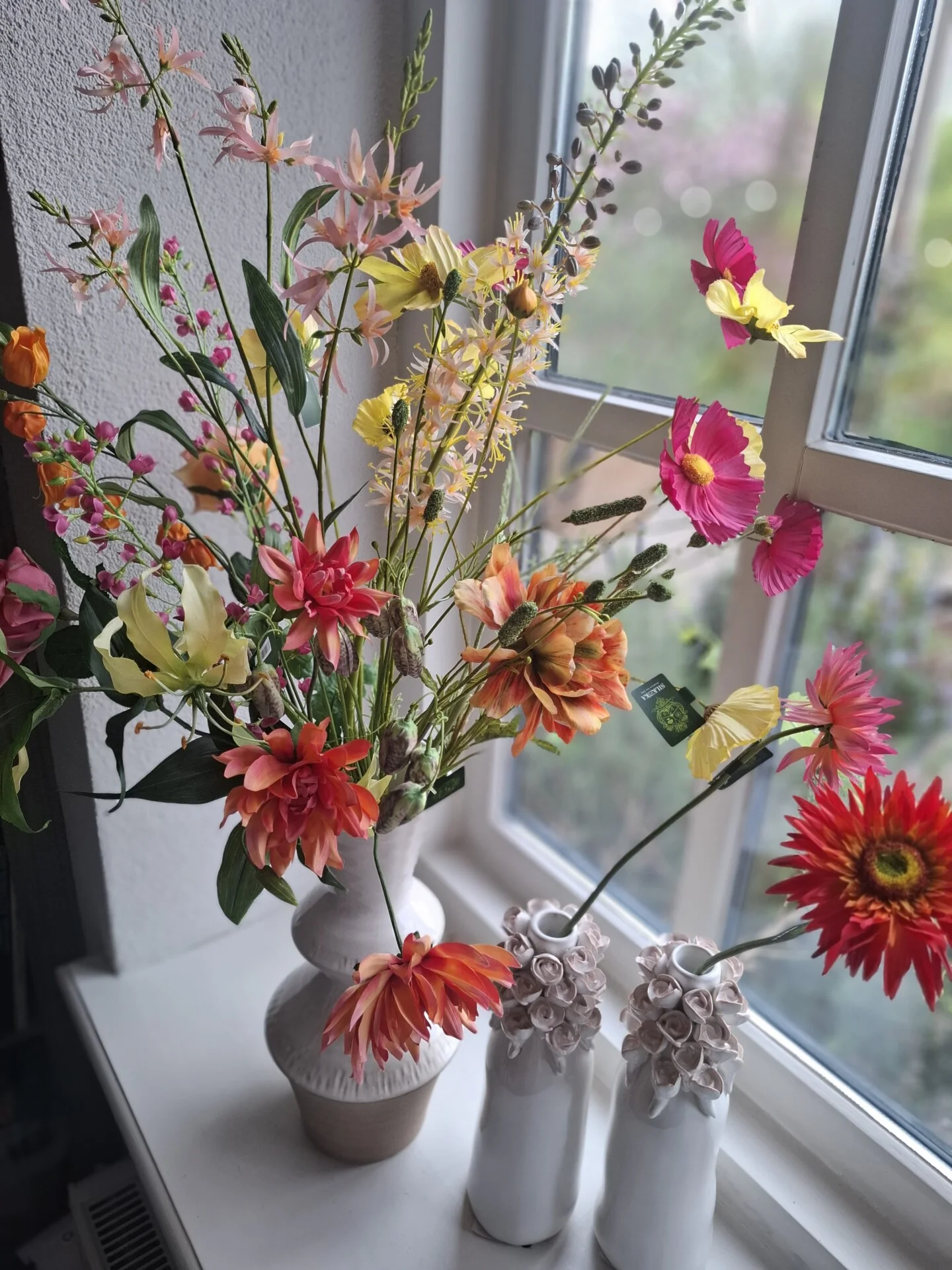 Een leuke roomkleurige keramiek vaas met beige rand met hierin een lief plukboeket