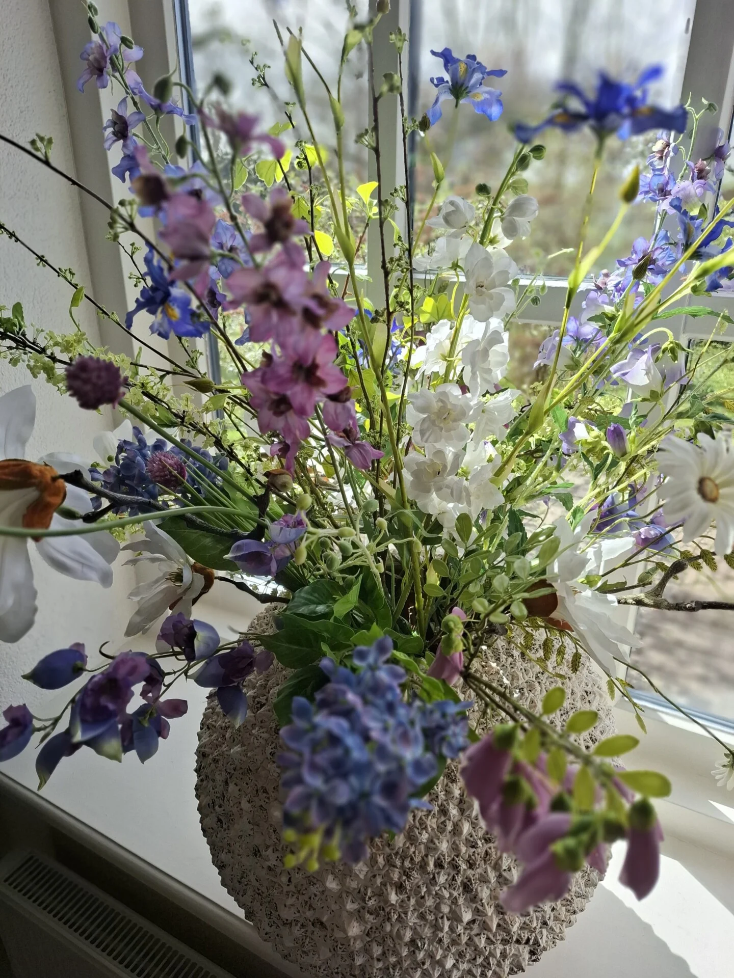 Een prachtige eyecatcher , deze schelpenbowl met XXL plukboeket in blauw wit tinten