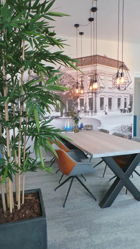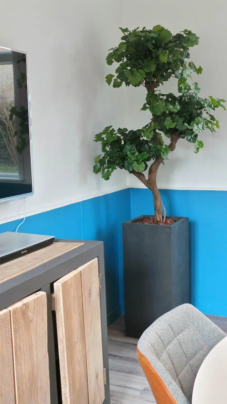 Om het interieur compleet te maken, is gekozen voor hoogwaardige kunstplanten in stijlvolle lood- en antracietkleurige bakken. Deze combinatie zorgt voor een moderne en verfijnde uitstraling, terwijl de ruimte een frisse en rustgevende ambiance behoudt.