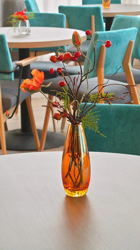Het interieur van dit crematorium en uitvaartcentrum is bijzonder kleurrijk, wat deze styling tot een mooie uitdaging maakte. In plaats van de traditionele ingetogen sfeer is hier gekozen voor een warme, levendige uitstraling die past bij de unieke inrichting.