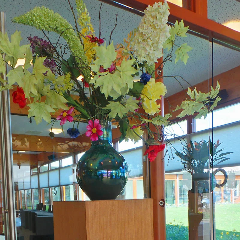 Voor verschillende gemeentehuizen in Noord-Nederland verzorg ik regelmatig de styling met zijdebloemstukken. Veel gemeenten maken gebruik van de mogelijkheid om deze te huren, zodat het interieur altijd een representatieve uitstraling heeft zonder extra onderhoud. Het personeel heeft er geen omkijken naar, want alles wordt volledig verzorgd. Afhankelijk van de ruimte wisselen we de arrangementen twee tot vier keer per jaar.