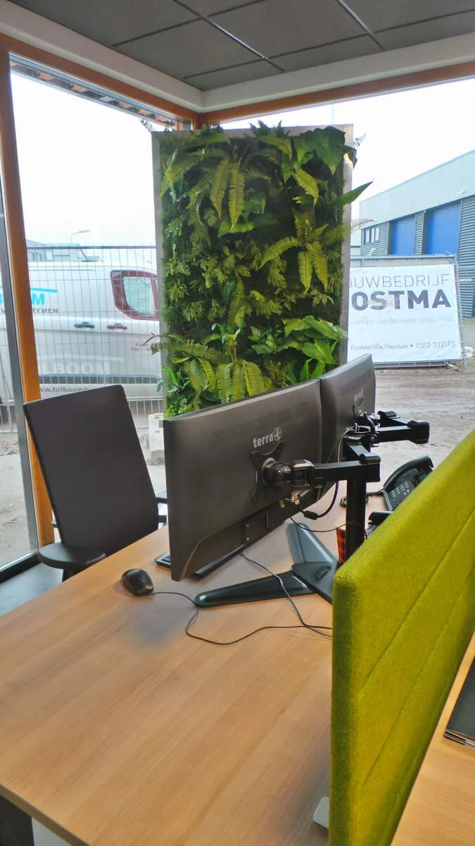 Met een combinatie van verschillende groentinten en structuren sluit het groen perfect aan bij de ruimte. De toegepaste groendecoratie zorgt niet alleen voor een esthetische meerwaarde, maar draagt ook bij aan een rustige en aangename werkomgeving. Dankzij de duurzame materialen blijft het geheel jarenlang mooi en onderhoudsvriendelijk.